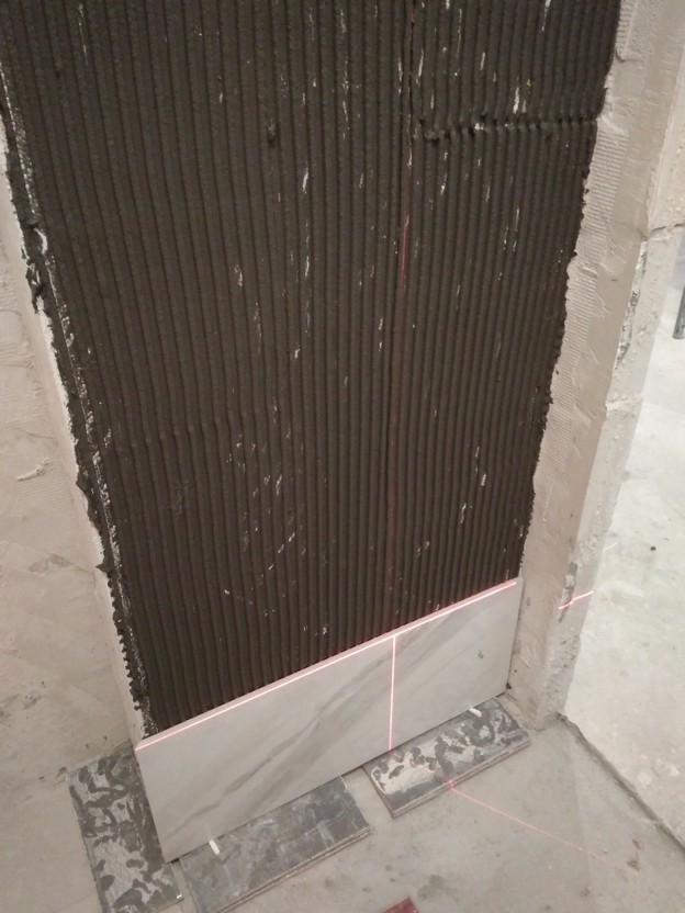Начинаю укладку всегда со сложных мест - в данном случае короб с 45 углом керамогранита